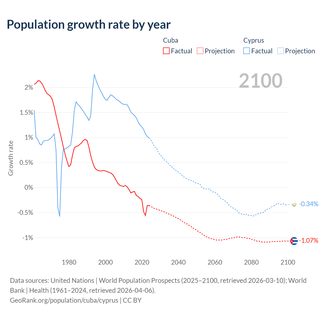 - For the last 10 years, Cuba has had an average growth rate of -0.26% per year vs +1.26% in Cyprus.
