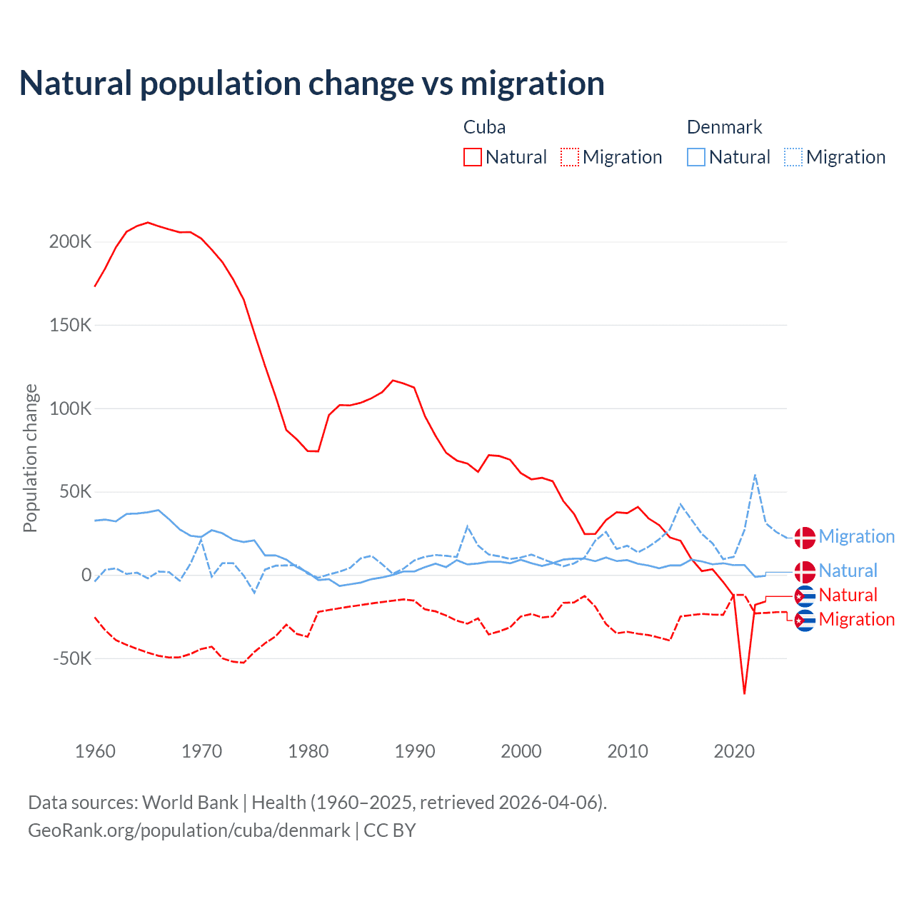 Over the last 10 years, 21.9% of the population change in Cuba is from natural causes (a loss of 64,179 people) and 78.1% is from migration (a loss of 229,508 people). In Denmark 15.4% is from natural causes (a gain of 51,826 people) and 84.6% is from migration (a gain of 284,848 people).