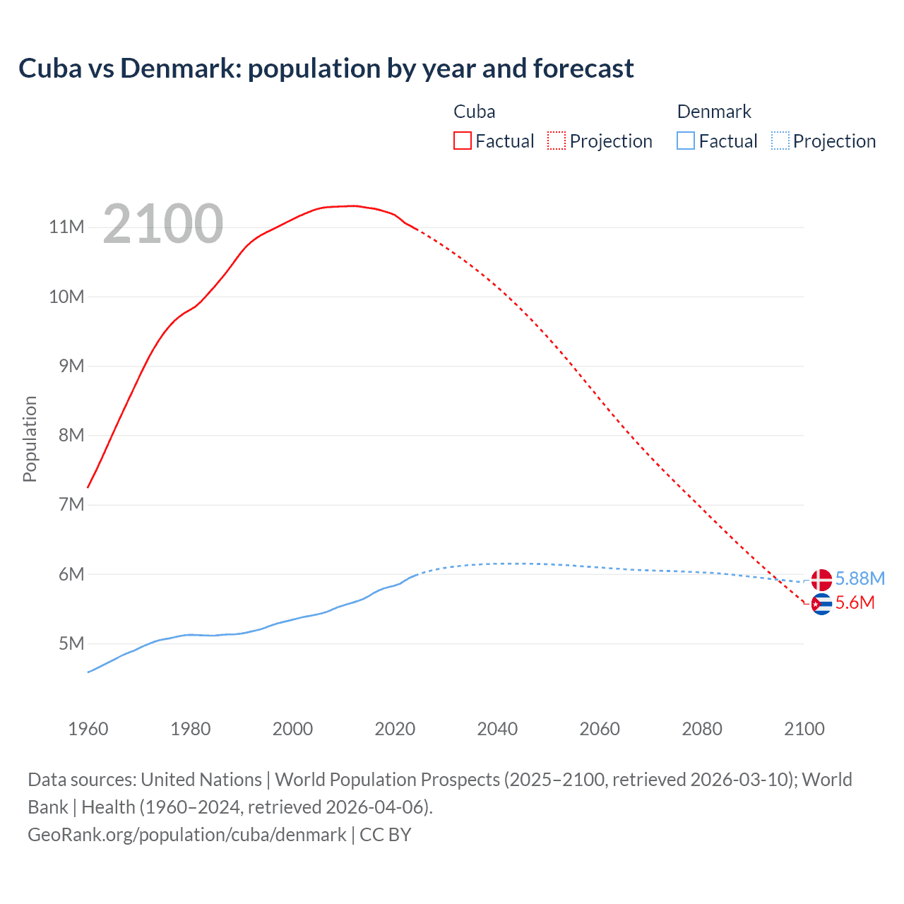 - Since 2006, the population of Cuba has decreased from 11.3M people to 10.9M (3.4% decline), while Denmark has grown from 5.44M to 6.03M (10.9% growth).