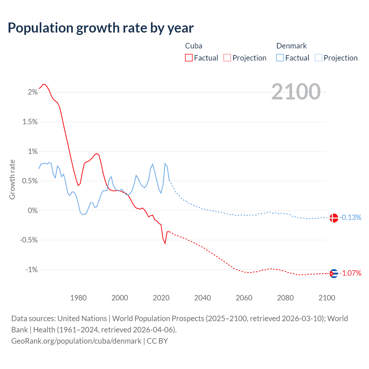 - For the last 10 years, Cuba has had an average growth rate of -0.26% per year vs +0.57% in Denmark.