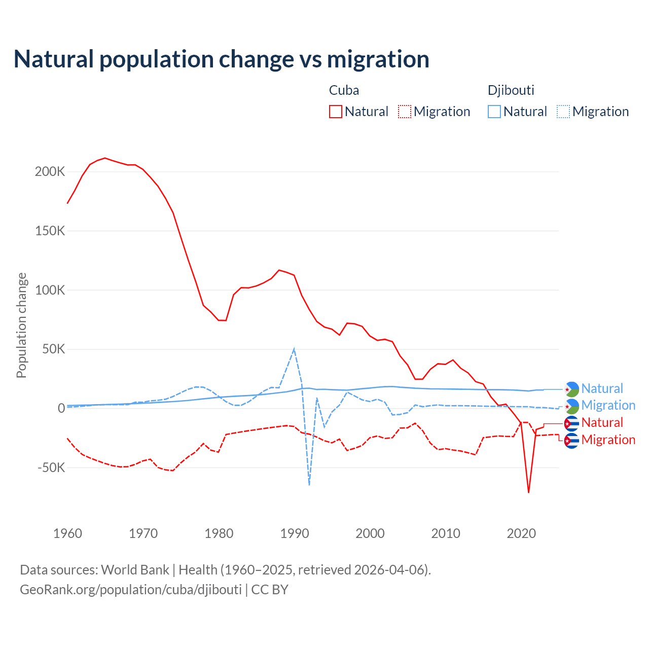 Over the last 10 years, 21.9% of the population change in Cuba is from natural causes (a loss of 64,179 people) and 78.1% is from migration (a loss of 229,508 people). In Djibouti 92.1% is from natural causes (a gain of 153,892 people) and 7.87% is from migration (a gain of 13,138 people).