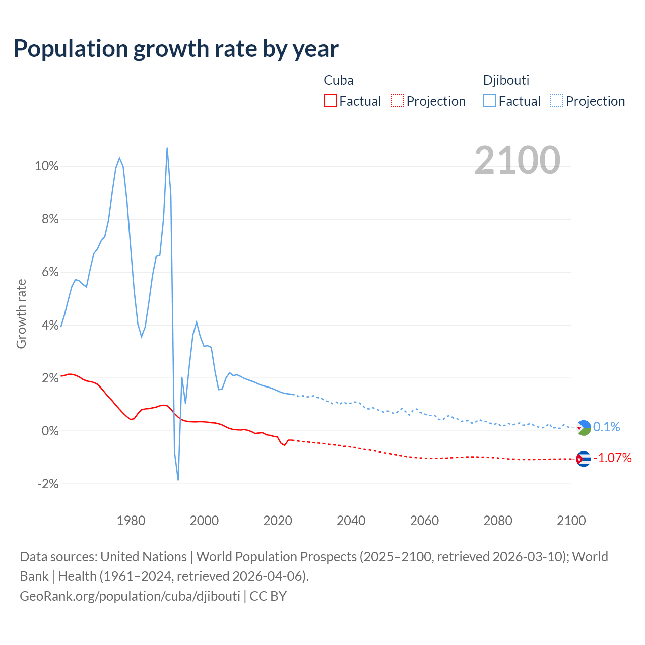 - For the last 10 years, Cuba has had an average growth rate of -0.26% per year vs +1.57% in Djibouti.