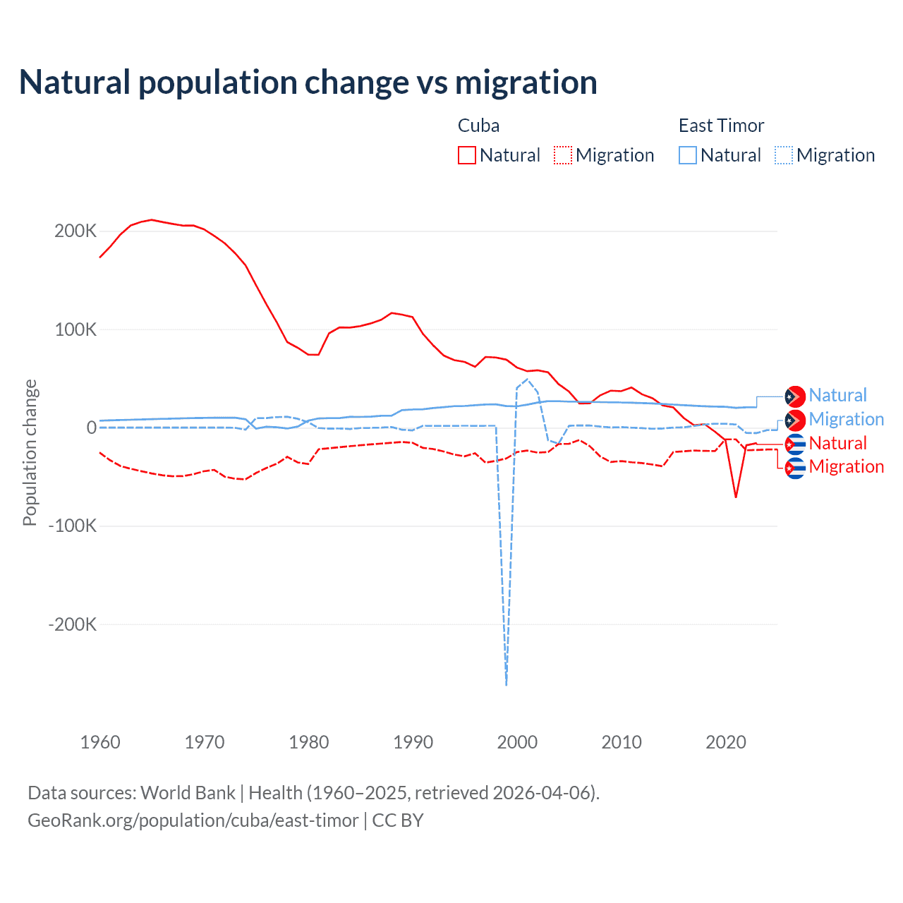 Over the last 10 years, 21.9% of the population change in Cuba is from natural causes (a loss of 64,179 people) and 78.1% is from migration (a loss of 229,508 people). In East Timor 98.3% is from natural causes (a gain of 217,698 people) and 1.66% is from migration (a gain of 3,665 people).