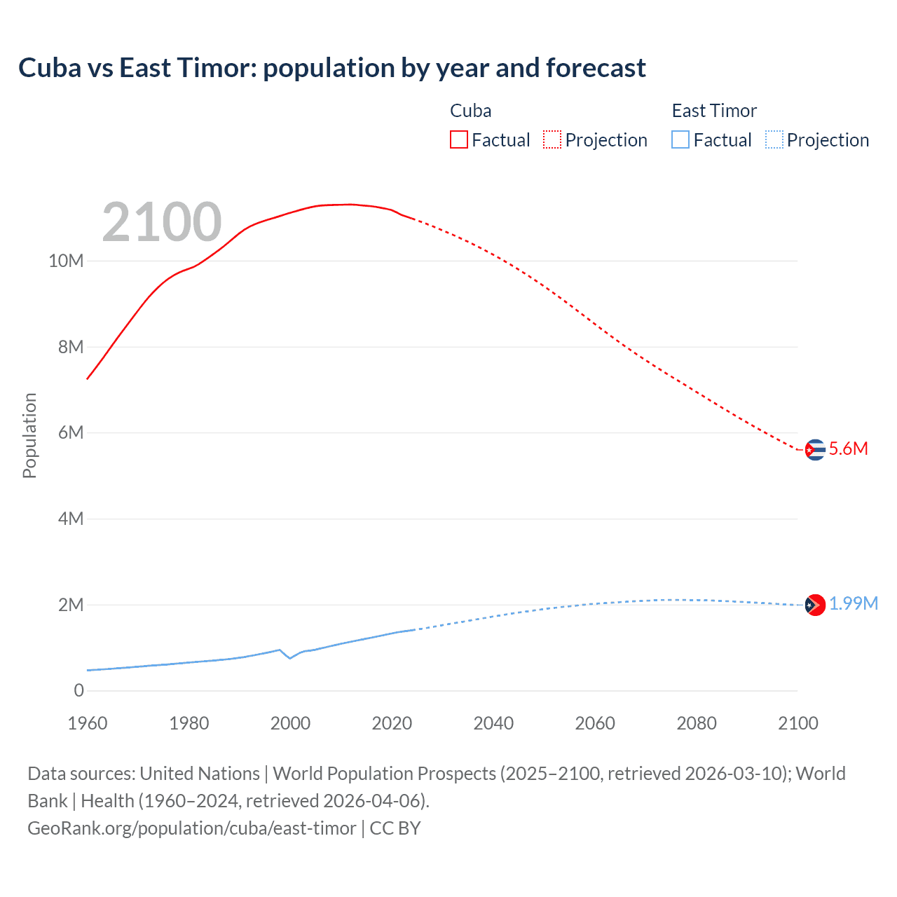 The latest officially reported population of Cuba was 10,979,783 in 2024 vs 1,400,638 people in East Timor in 2024. In 2026, based on the adjusted UN estimation, the current Cuba's population is 10,894,785 people compared to 1,441,764 in East Timor.