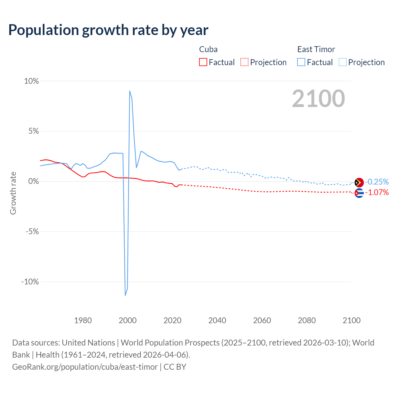 - For the last 10 years, Cuba has had an average growth rate of -0.26% per year vs +1.74% in East Timor.
