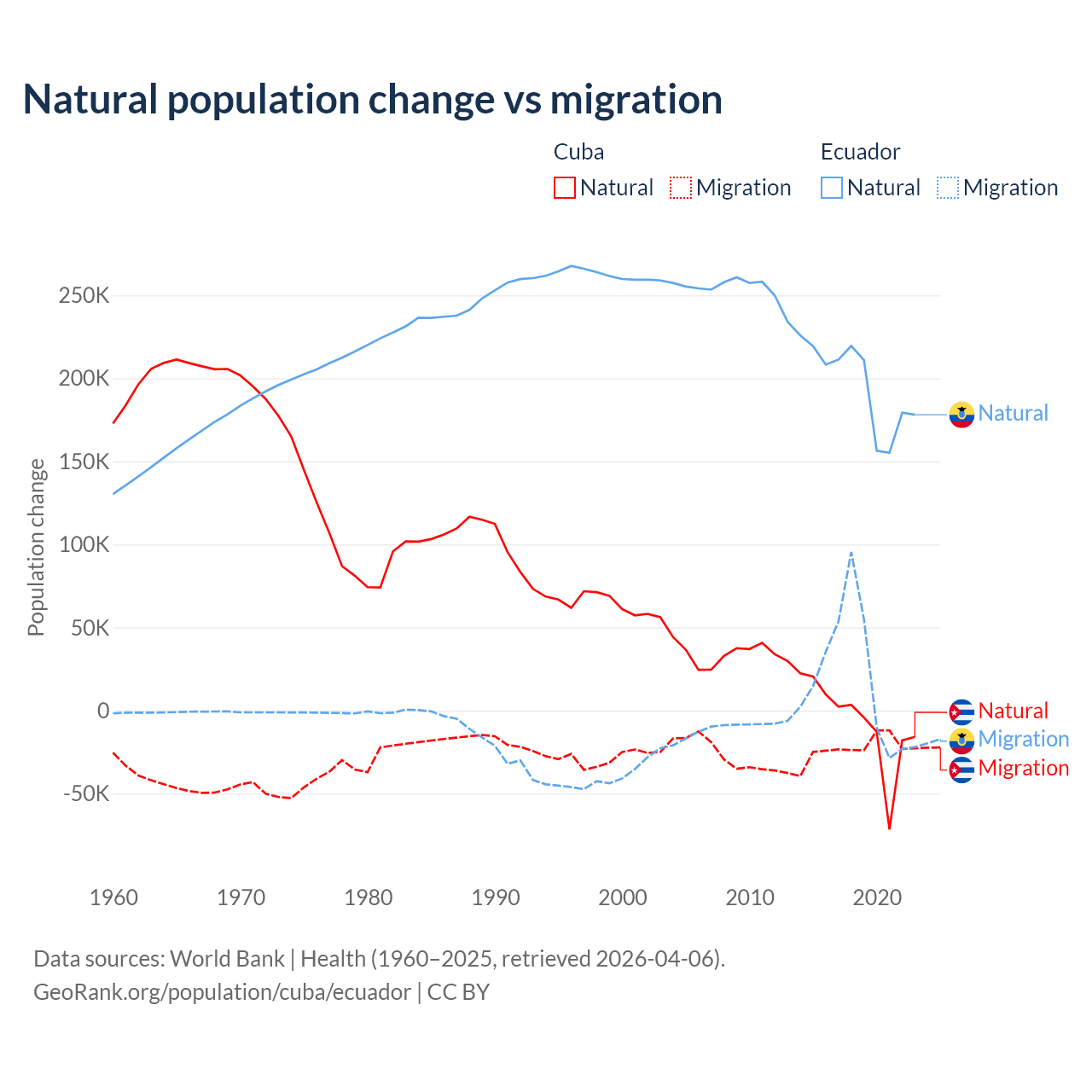 Over the last 10 years, 21.9% of the population change in Cuba is from natural causes (a loss of 64,179 people) and 78.1% is from migration (a loss of 229,508 people). In Ecuador 91.9% is from natural causes (a gain of 1,964,352 people) and 8.08% is from migration (a gain of 172,707 people).