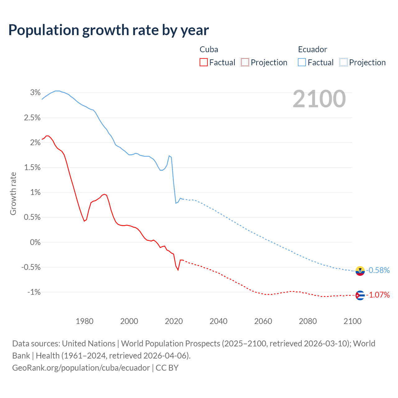 - For the last 10 years, Cuba has had an average growth rate of -0.26% per year vs +1.26% in Ecuador.