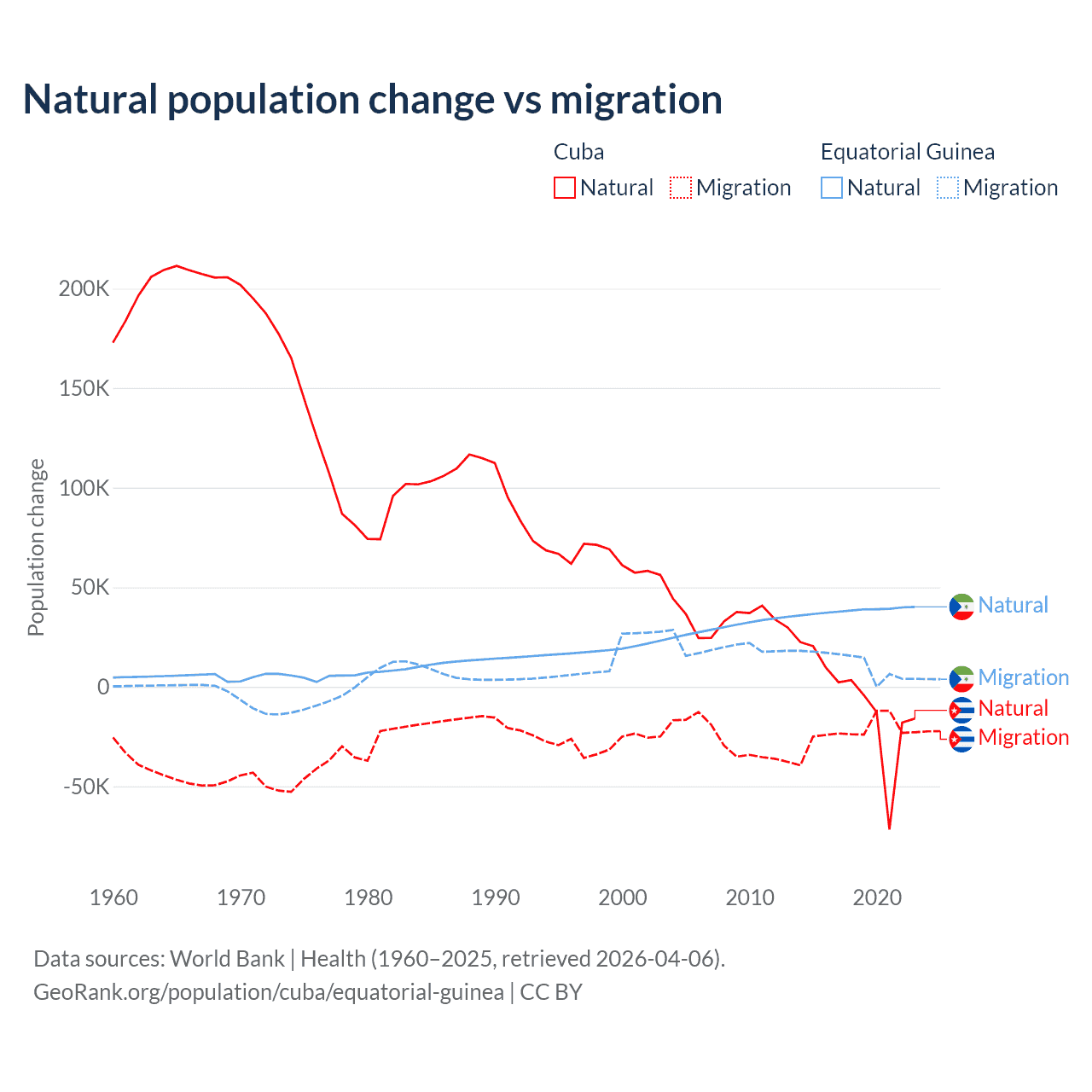 Over the last 10 years, 21.9% of the population change in Cuba is from natural causes (a loss of 64,179 people) and 78.1% is from migration (a loss of 229,508 people). In Equatorial Guinea 77% is from natural causes (a gain of 382,745 people) and 23% is from migration (a gain of 114,024 people).