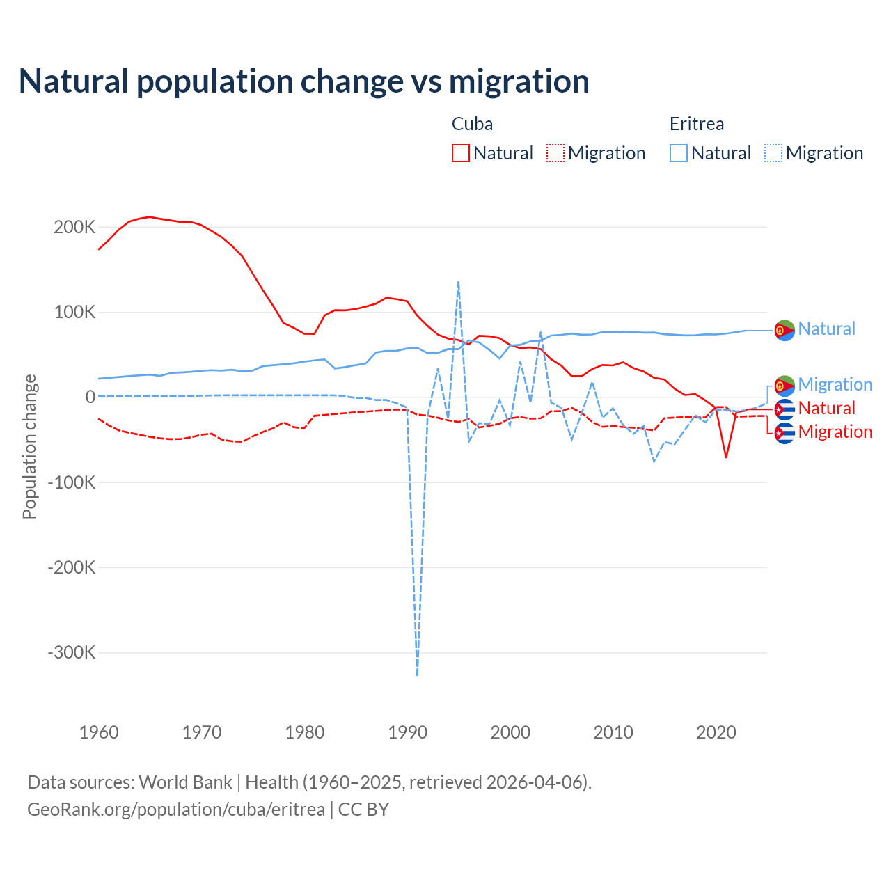 Over the last 10 years, 21.9% of the population change in Cuba is from natural causes (a loss of 64,179 people) and 78.1% is from migration (a loss of 229,508 people). In Eritrea 68.8% is from natural causes (a gain of 742,837 people) and 31.2% is from migration (a loss of 336,243 people).