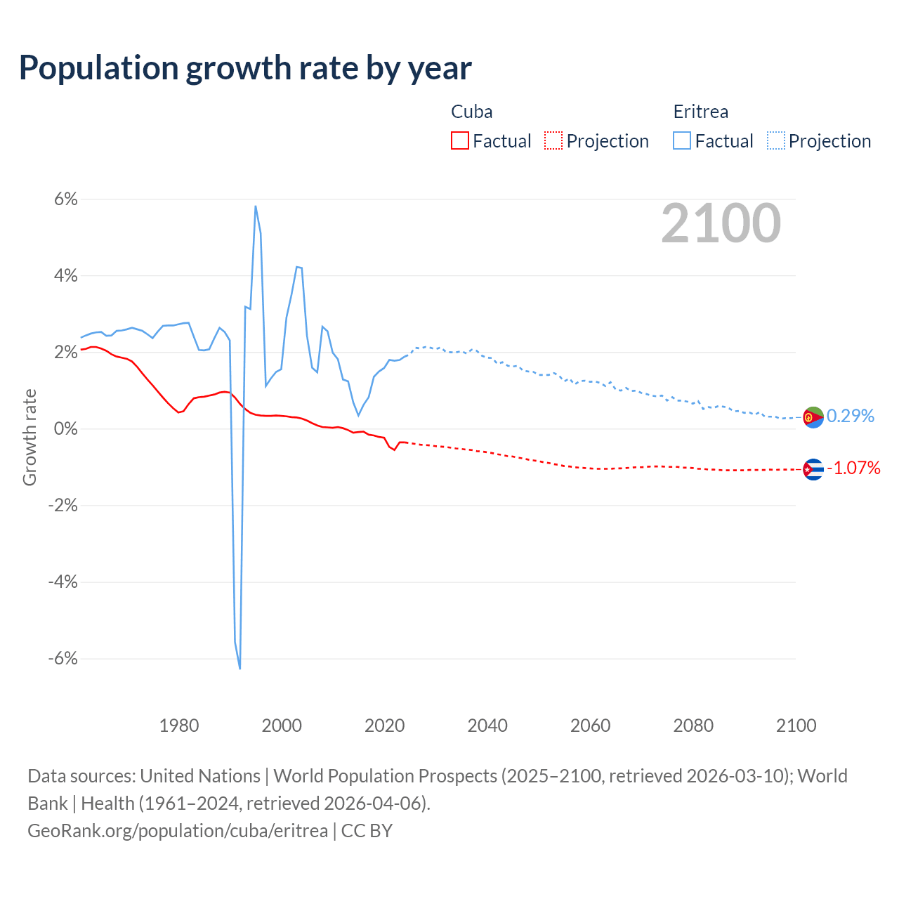 - For the last 10 years, Cuba has had an average growth rate of -0.26% per year vs +1.28% in Eritrea.