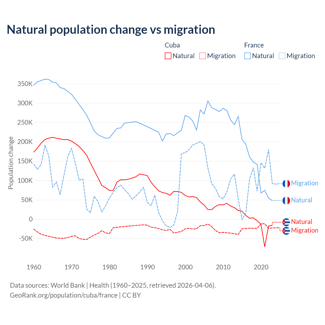 Over the last 10 years, 21.9% of the population change in Cuba is from natural causes (a loss of 64,179 people) and 78.1% is from migration (a loss of 229,508 people). In France 59.5% is from natural causes (a gain of 1,359,540 people) and 40.5% is from migration (a gain of 923,723 people).