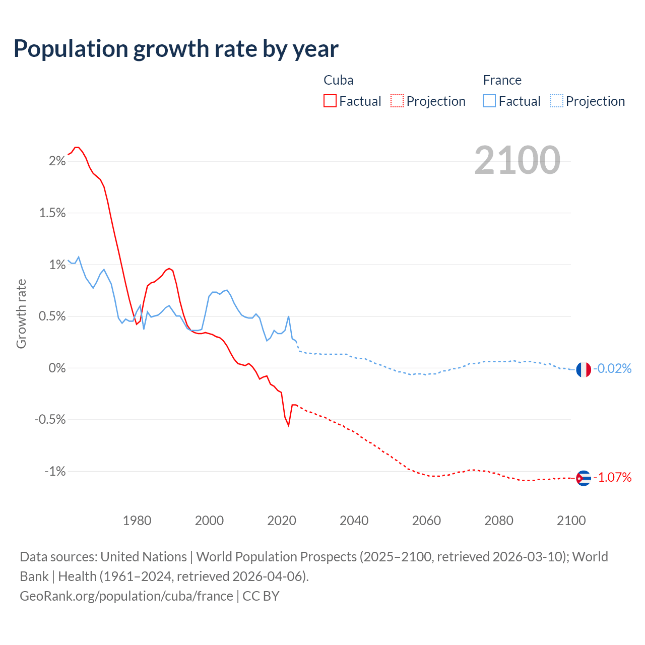 - For the last 10 years, Cuba has had an average growth rate of -0.26% per year vs +0.35% in France.