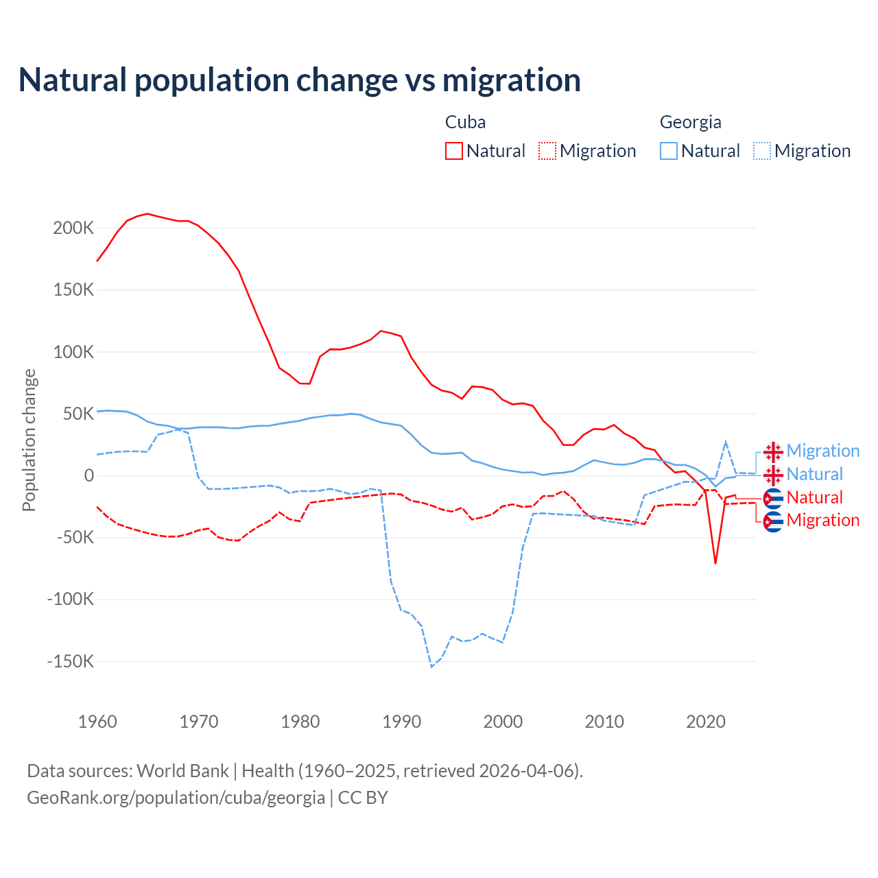 Over the last 10 years, 21.9% of the population change in Cuba is from natural causes (a loss of 64,179 people) and 78.1% is from migration (a loss of 229,508 people). In Georgia 57.7% is from natural causes (a gain of 47,646 people) and 42.3% is from migration (a loss of 34,907 people).