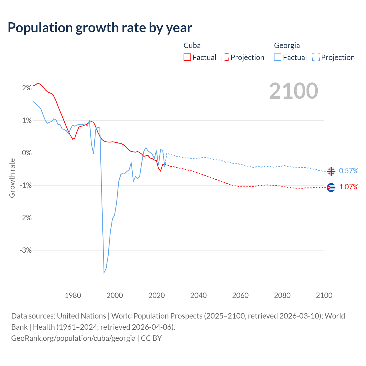 - For the last 10 years, Cuba has had an average growth rate of -0.26% per year vs -0.04% in Georgia.