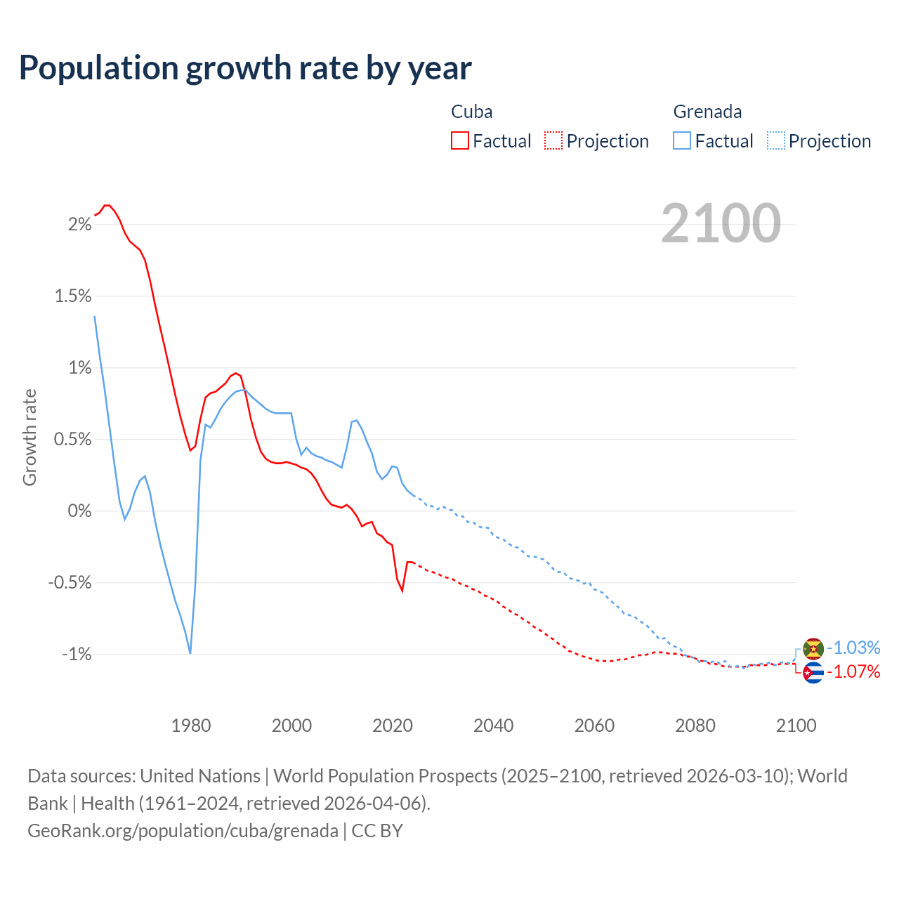 - For the last 10 years, Cuba has had an average growth rate of -0.26% per year vs +0.29% in Grenada.