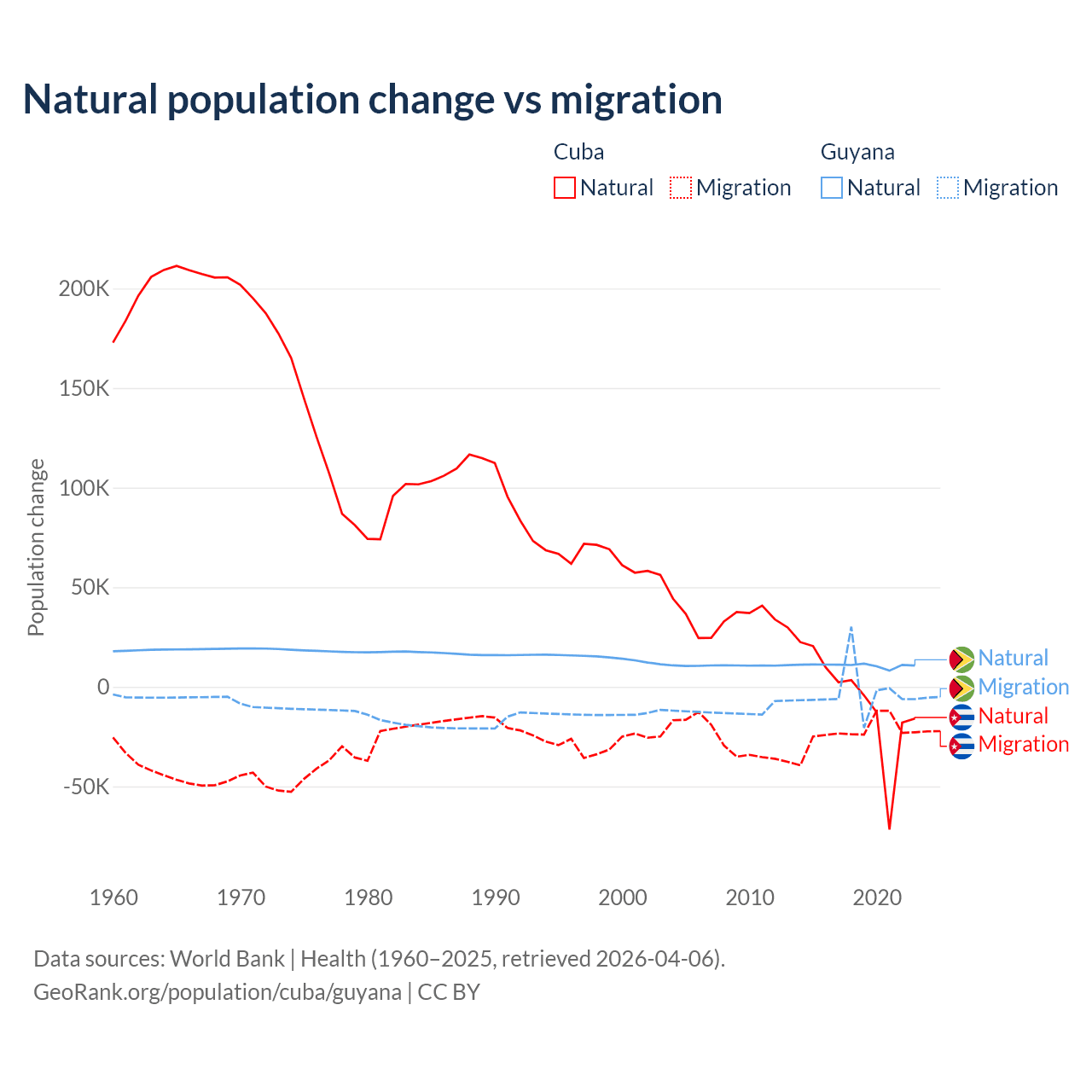 Over the last 10 years, 21.9% of the population change in Cuba is from natural causes (a loss of 64,179 people) and 78.1% is from migration (a loss of 229,508 people). In Guyana 77.7% is from natural causes (a gain of 107,419 people) and 22.3% is from migration (a loss of 30,797 people).