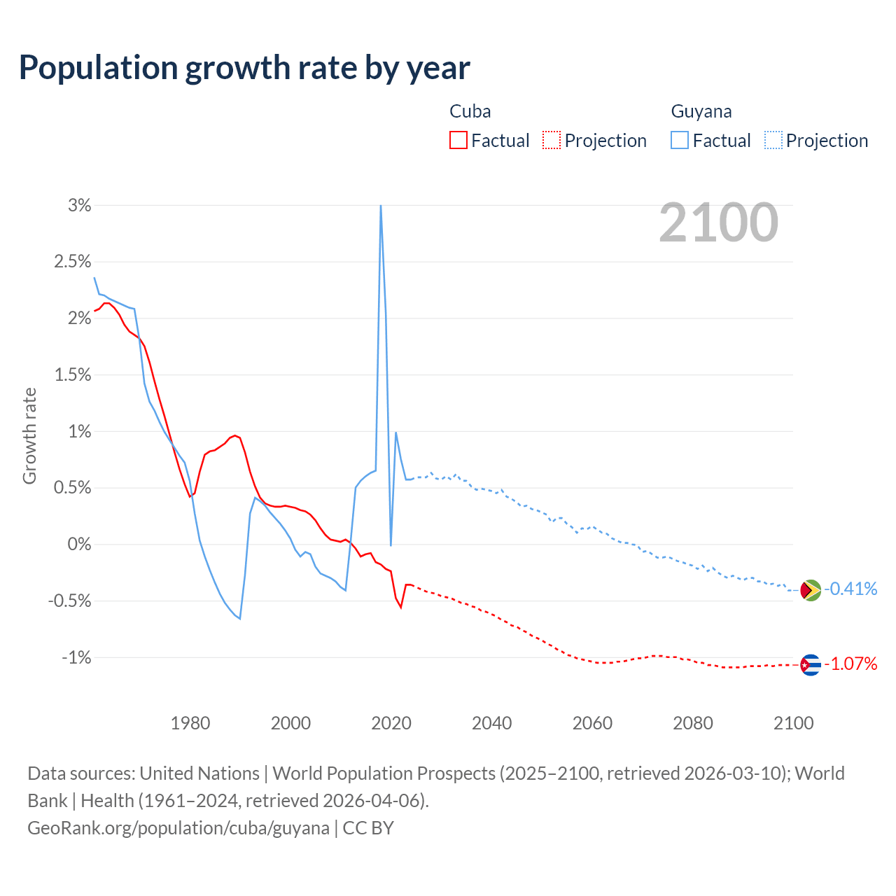 - For the last 10 years, Cuba has had an average growth rate of -0.26% per year vs +0.94% in Guyana.