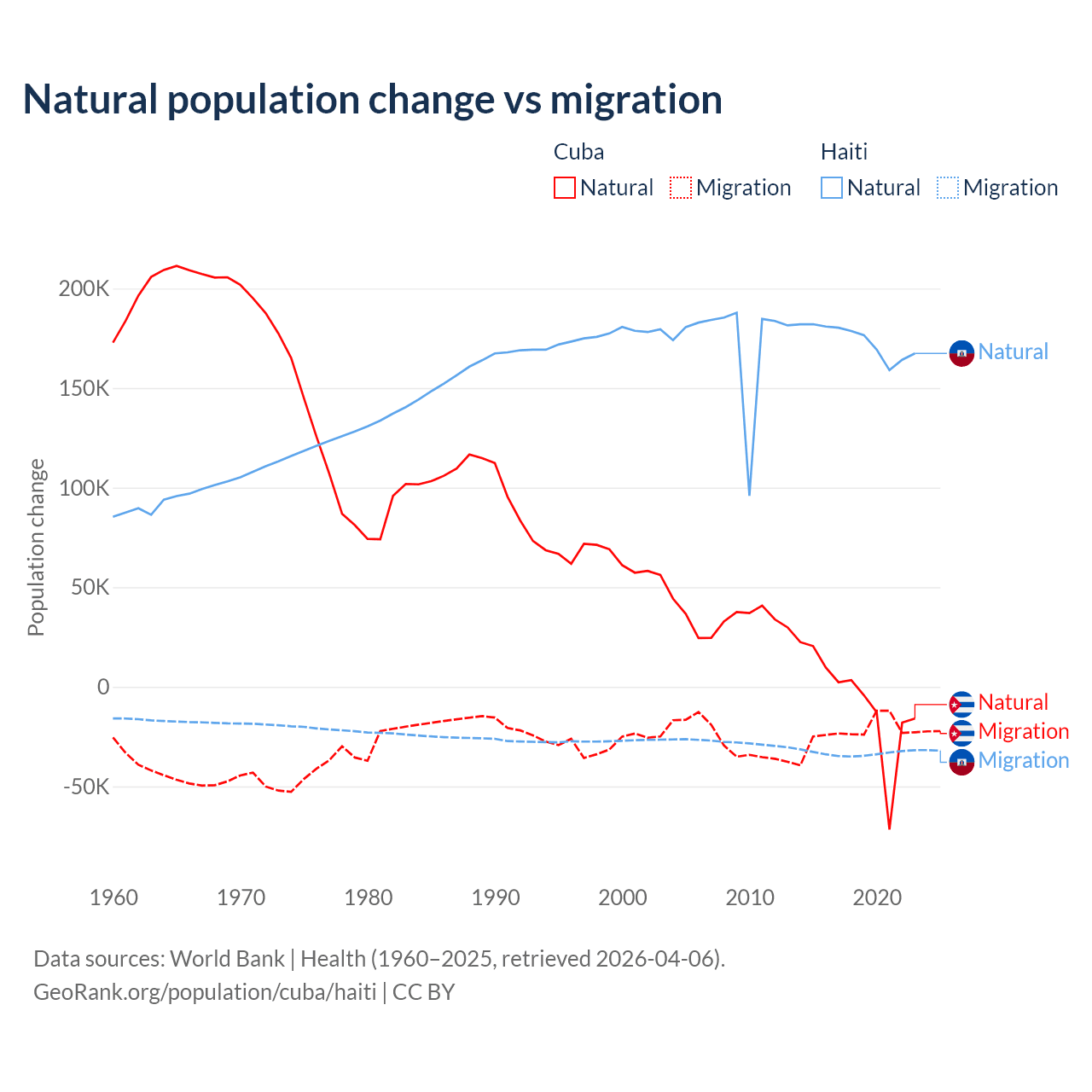 Over the last 10 years, 21.9% of the population change in Cuba is from natural causes (a loss of 64,179 people) and 78.1% is from migration (a loss of 229,508 people). In Haiti 83.9% is from natural causes (a gain of 1,740,319 people) and 16.1% is from migration (a loss of 333,076 people).