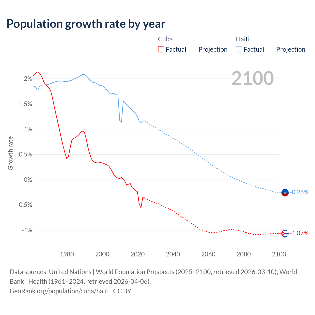 - For the last 10 years, Cuba has had an average growth rate of -0.26% per year vs +1.29% in Haiti.