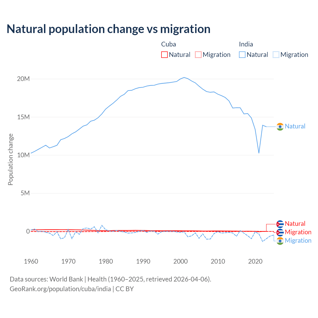 Over the last 10 years, 21.9% of the population change in Cuba is from natural causes (a loss of 64,179 people) and 78.1% is from migration (a loss of 229,508 people). In India 96.4% is from natural causes (a gain of 145,503,378 people) and 3.56% is from migration (a loss of 5,376,884 people).