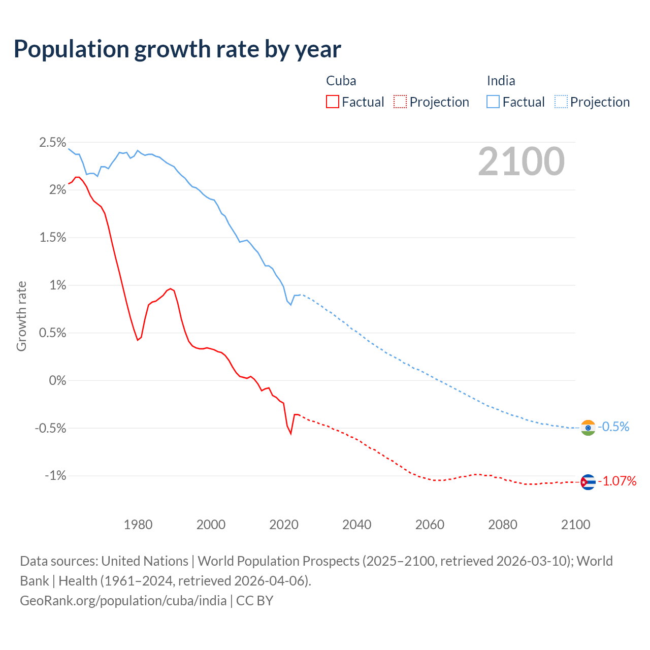 - For the last 10 years, Cuba has had an average growth rate of -0.26% per year vs +1.03% in India.