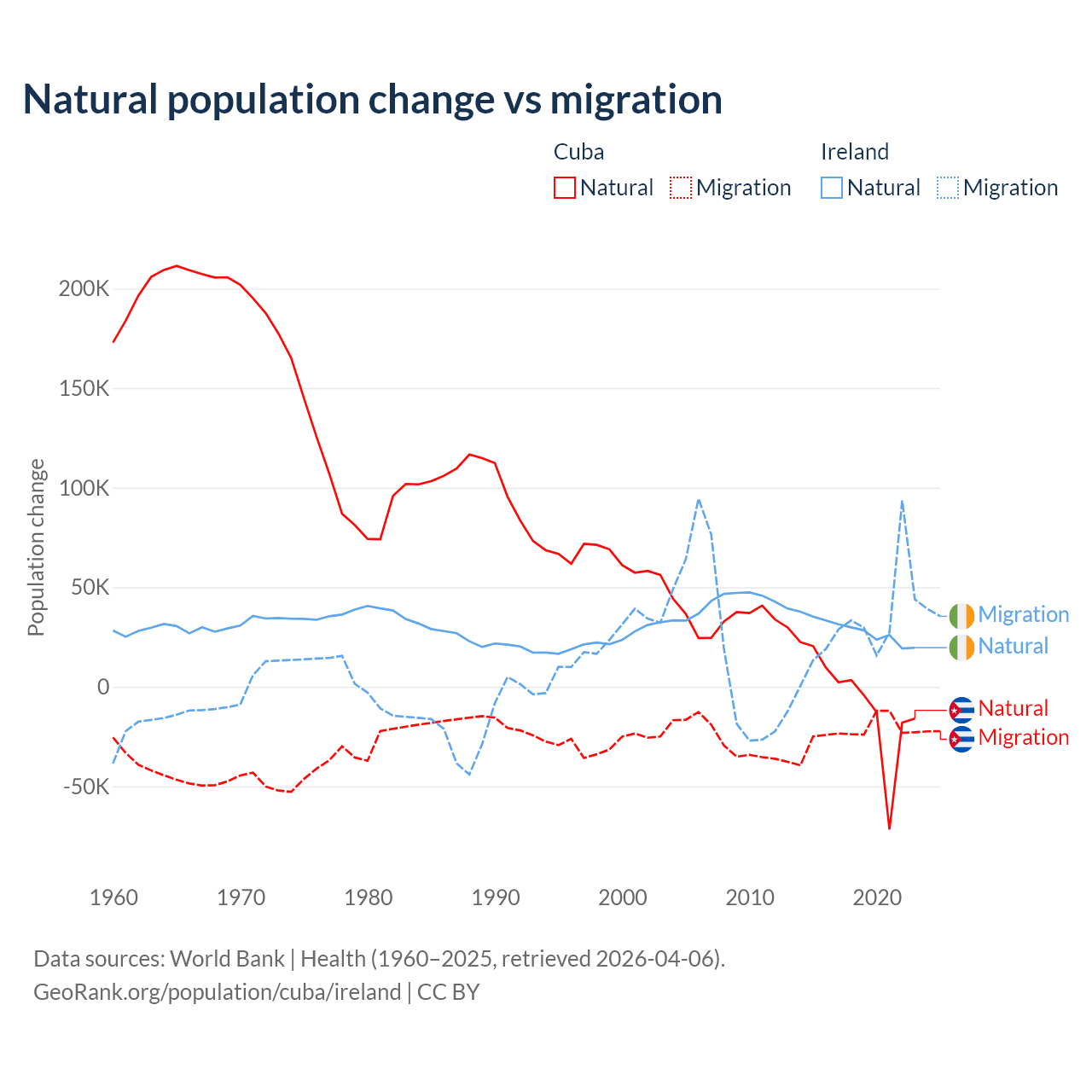 Over the last 10 years, 21.9% of the population change in Cuba is from natural causes (a loss of 64,179 people) and 78.1% is from migration (a loss of 229,508 people). In Ireland 48.2% is from natural causes (a gain of 284,644 people) and 51.8% is from migration (a gain of 305,297 people).