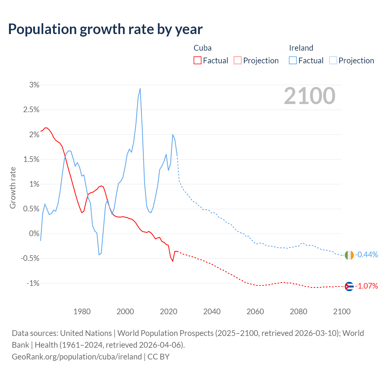 - For the last 10 years, Cuba has had an average growth rate of -0.26% per year vs +1.41% in Ireland.