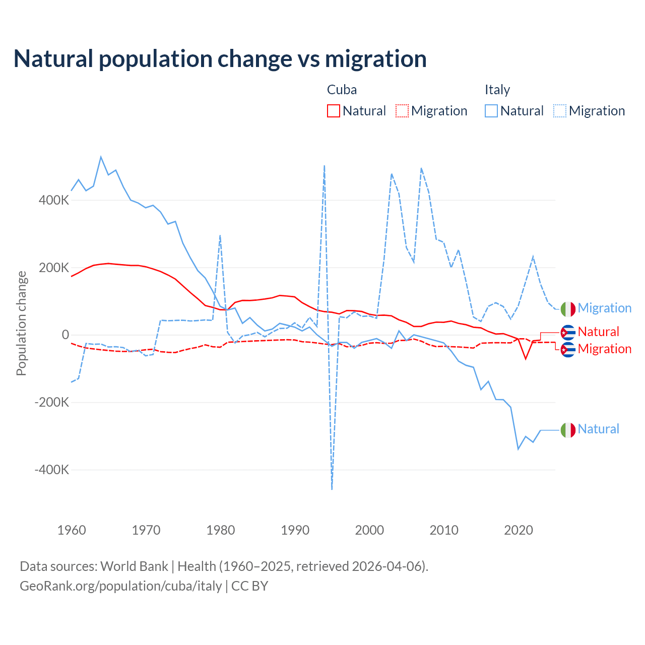 Over the last 10 years, 21.9% of the population change in Cuba is from natural causes (a loss of 64,179 people) and 78.1% is from migration (a loss of 229,508 people). In Italy 68.6% is from natural causes (a loss of 2,239,084 people) and 31.4% is from migration (a gain of 1,026,128 people).