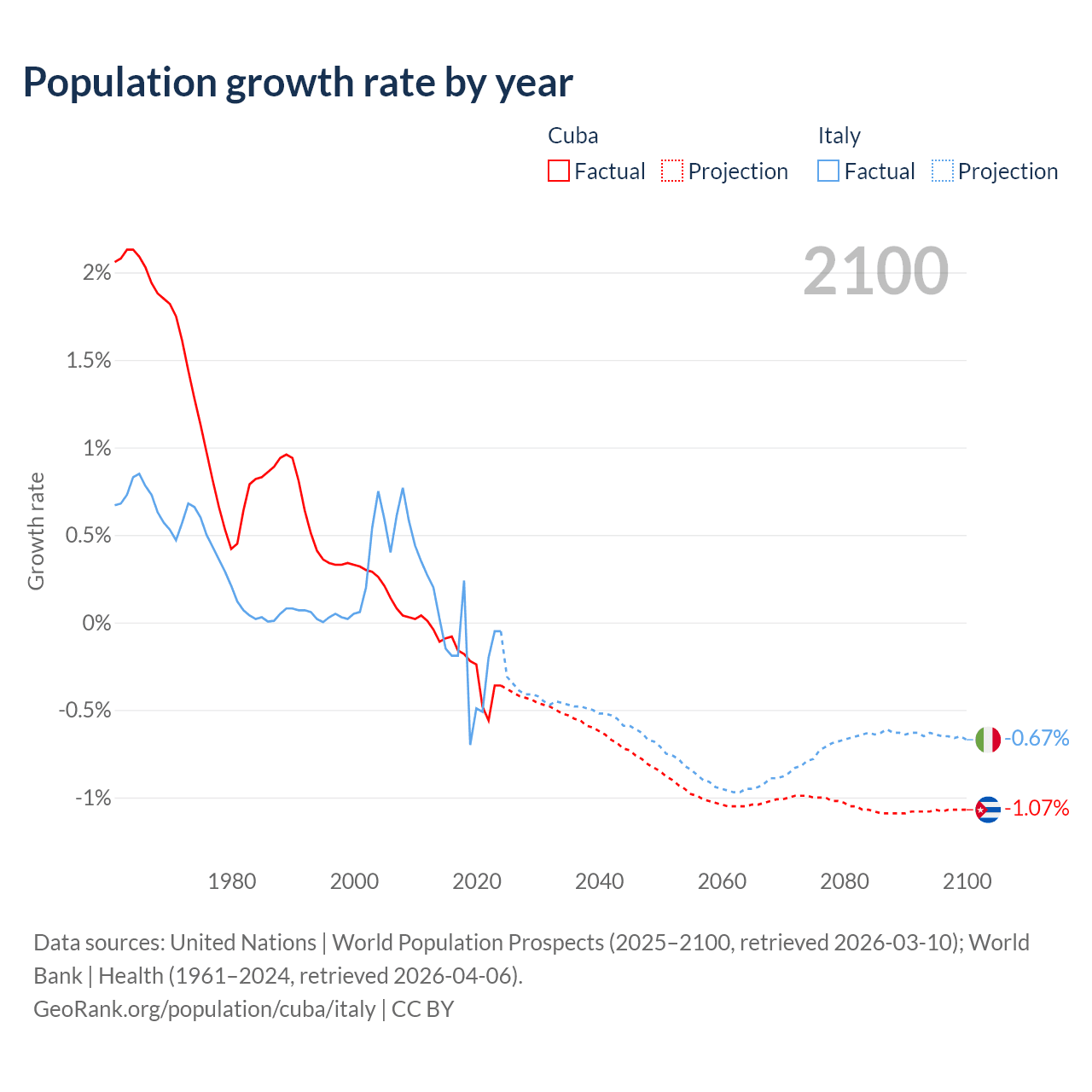- For the last 10 years, Cuba has had an average growth rate of -0.26% per year vs -0.21% in Italy.