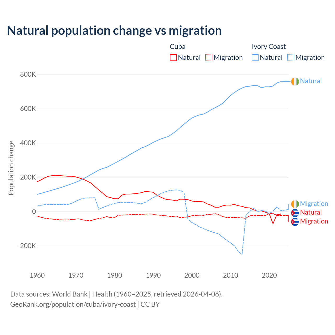 Over the last 10 years, 21.9% of the population change in Cuba is from natural causes (a loss of 64,179 people) and 78.1% is from migration (a loss of 229,508 people). In Ivory Coast 99.7% is from natural causes (a gain of 7,348,944 people) and 0.33% is from migration (a gain of 24,432 people).