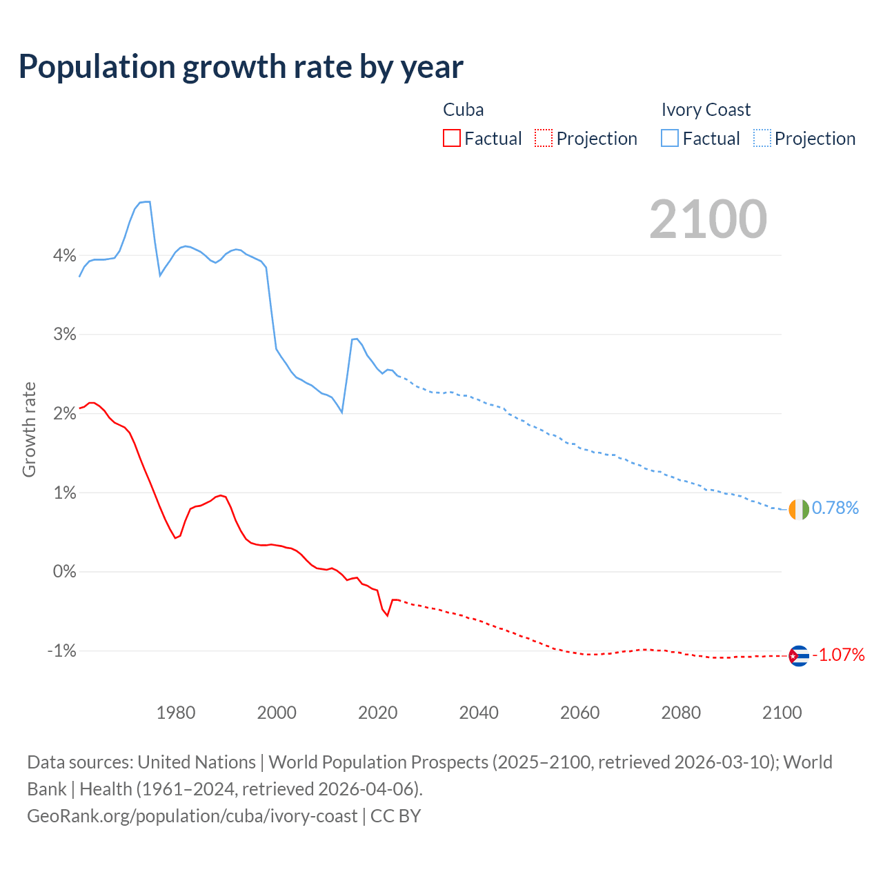 - For the last 10 years, Cuba has had an average growth rate of -0.26% per year vs +2.65% in Ivory Coast.