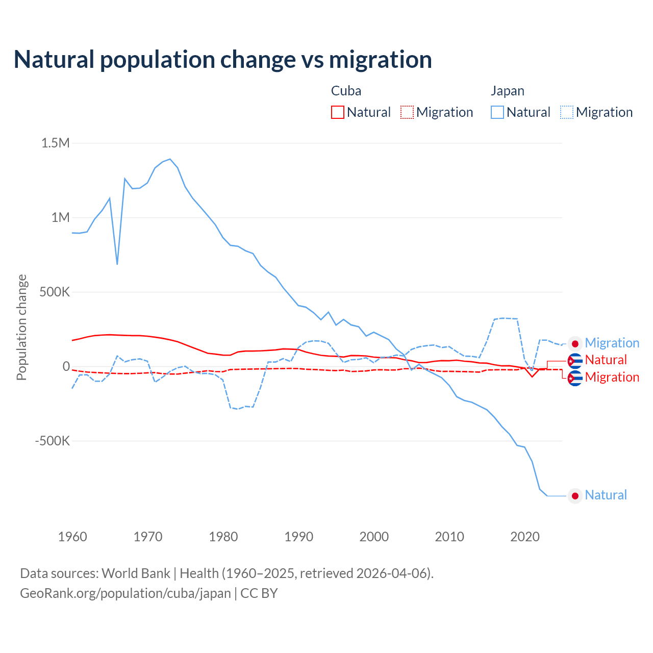 Over the last 10 years, 21.9% of the population change in Cuba is from natural causes (a loss of 64,179 people) and 78.1% is from migration (a loss of 229,508 people). In Japan 73.6% is from natural causes (a loss of 5,178,838 people) and 26.4% is from migration (a gain of 1,860,103 people).