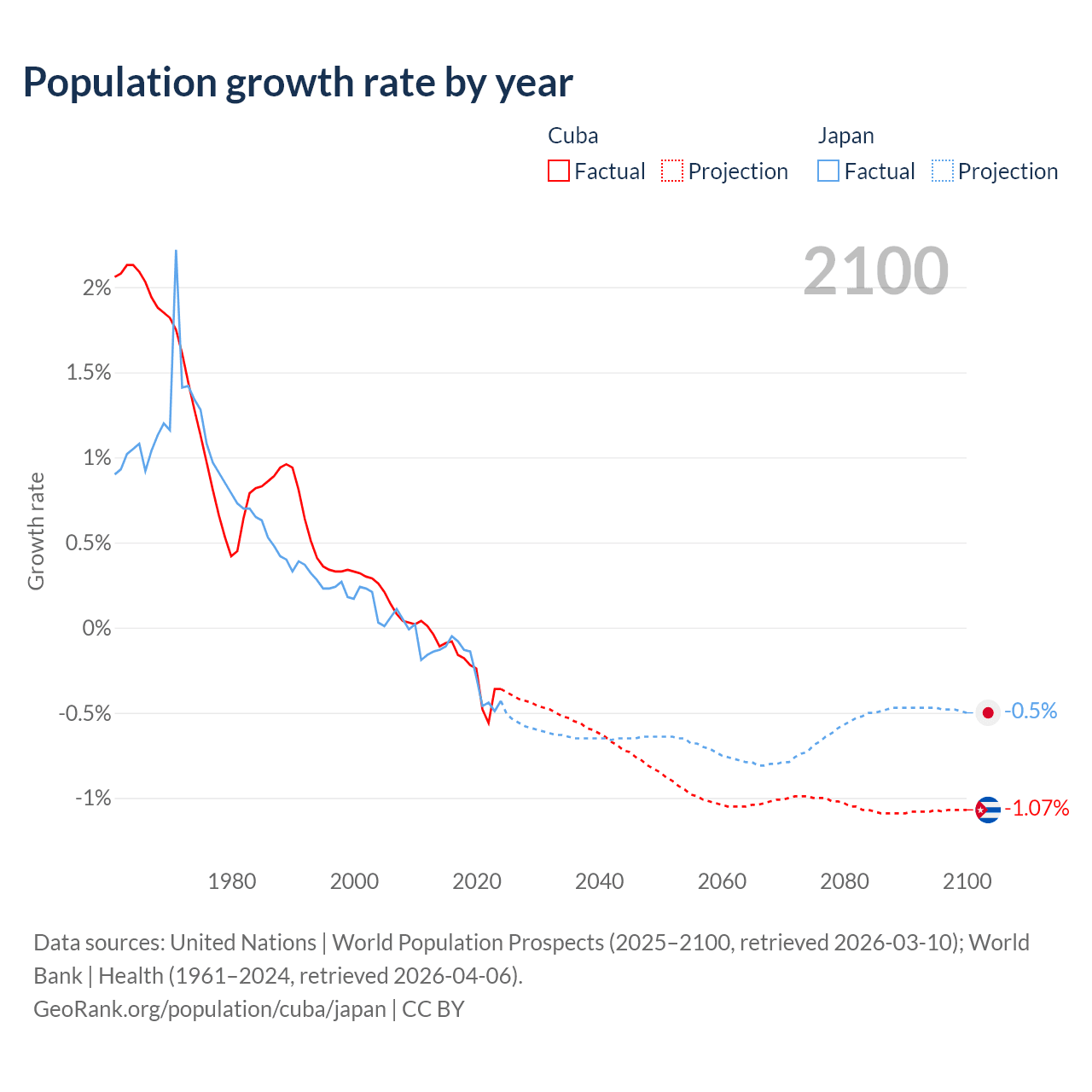 - For the last 10 years, Cuba has had an average growth rate of -0.26% per year vs -0.25% in Japan.