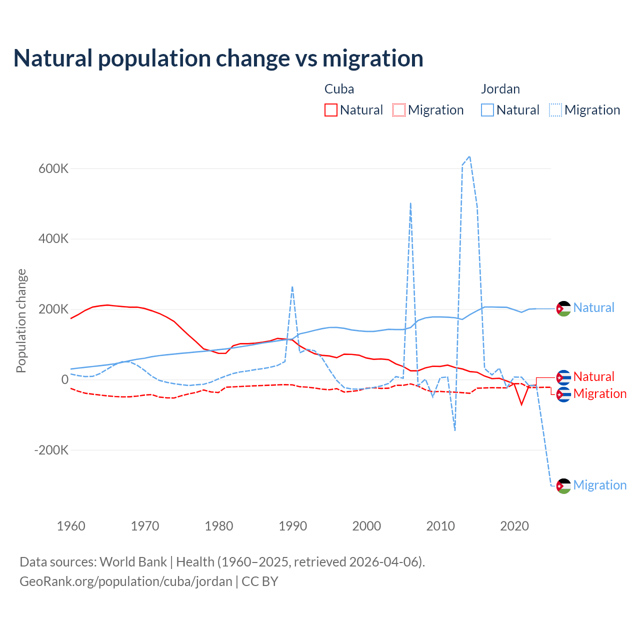 Over the last 10 years, 21.9% of the population change in Cuba is from natural causes (a loss of 64,179 people) and 78.1% is from migration (a loss of 229,508 people). In Jordan 63.2% is from natural causes (a gain of 1,991,452 people) and 36.8% is from migration (a gain of 1,157,625 people).