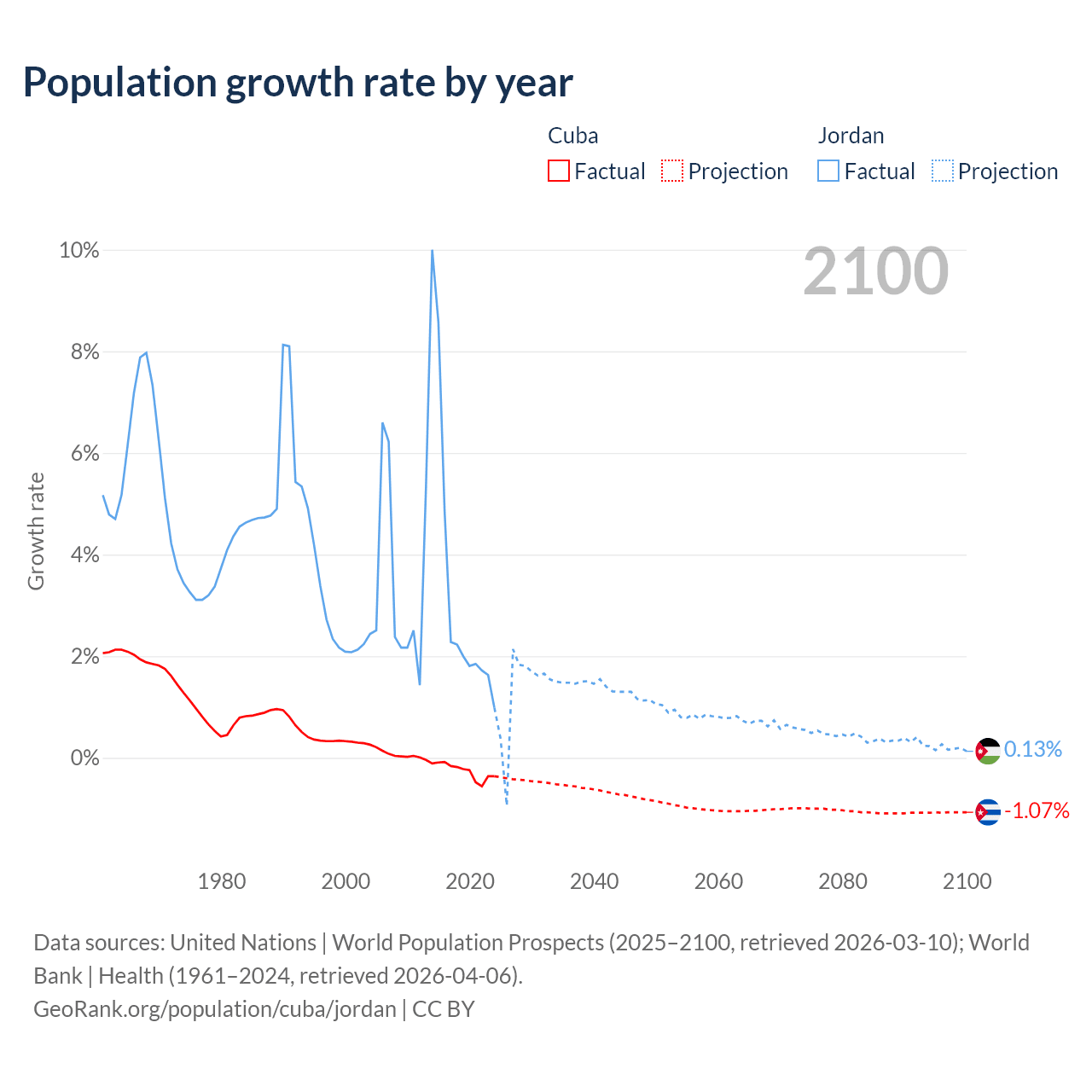 - Since 2006, the population of Cuba has decreased from 11.3M people to 10.9M (3.4% decline), while Jordan has grown from 6.43M to 11.6M (79.8% growth).