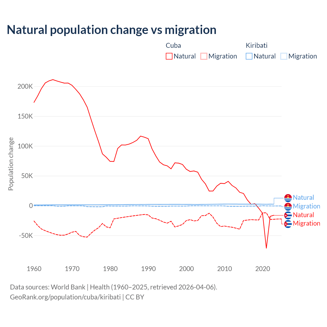 Over the last 10 years, 21.9% of the population change in Cuba is from natural causes (a loss of 64,179 people) and 78.1% is from migration (a loss of 229,508 people). In Kiribati 80% is from natural causes (a gain of 25,262 people) and 20% is from migration (a loss of 6,330 people).