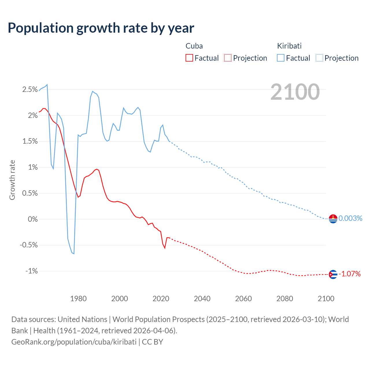 - For the last 10 years, Cuba has had an average growth rate of -0.26% per year vs +1.53% in Kiribati.