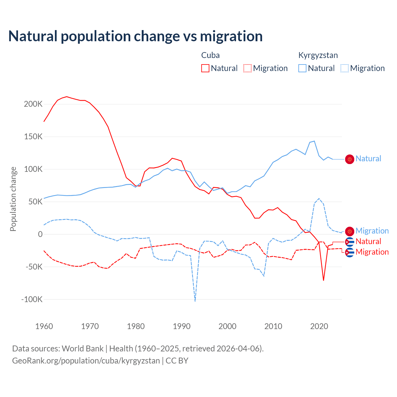 Over the last 10 years, 21.9% of the population change in Cuba is from natural causes (a loss of 64,179 people) and 78.1% is from migration (a loss of 229,508 people). In Kyrgyzstan 88.5% is from natural causes (a gain of 1,258,837 people) and 11.5% is from migration (a gain of 164,132 people).