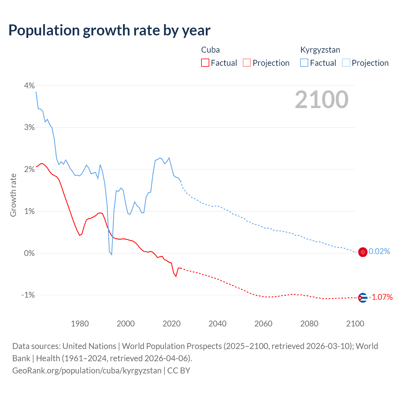 Data sources: World Bank | Health (1960–2024, retrieved 2026-04-06); United Nations | World Population Prospects (1960–2026, retrieved 2026-03-10); U.S. Census Bureau (1960–2025, retrieved 2026-02-08); Central Intelligence Agency (CIA) (2000–2019, retrieved 2026-02-20).