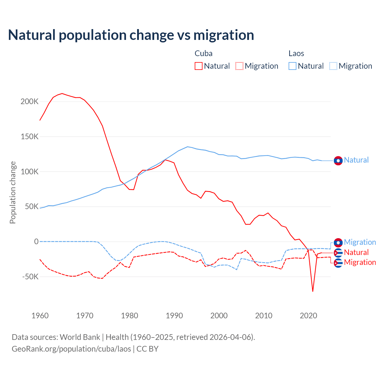 Over the last 10 years, 21.9% of the population change in Cuba is from natural causes (a loss of 64,179 people) and 78.1% is from migration (a loss of 229,508 people). In Laos 90.6% is from natural causes (a gain of 1,183,013 people) and 9.41% is from migration (a loss of 122,899 people).