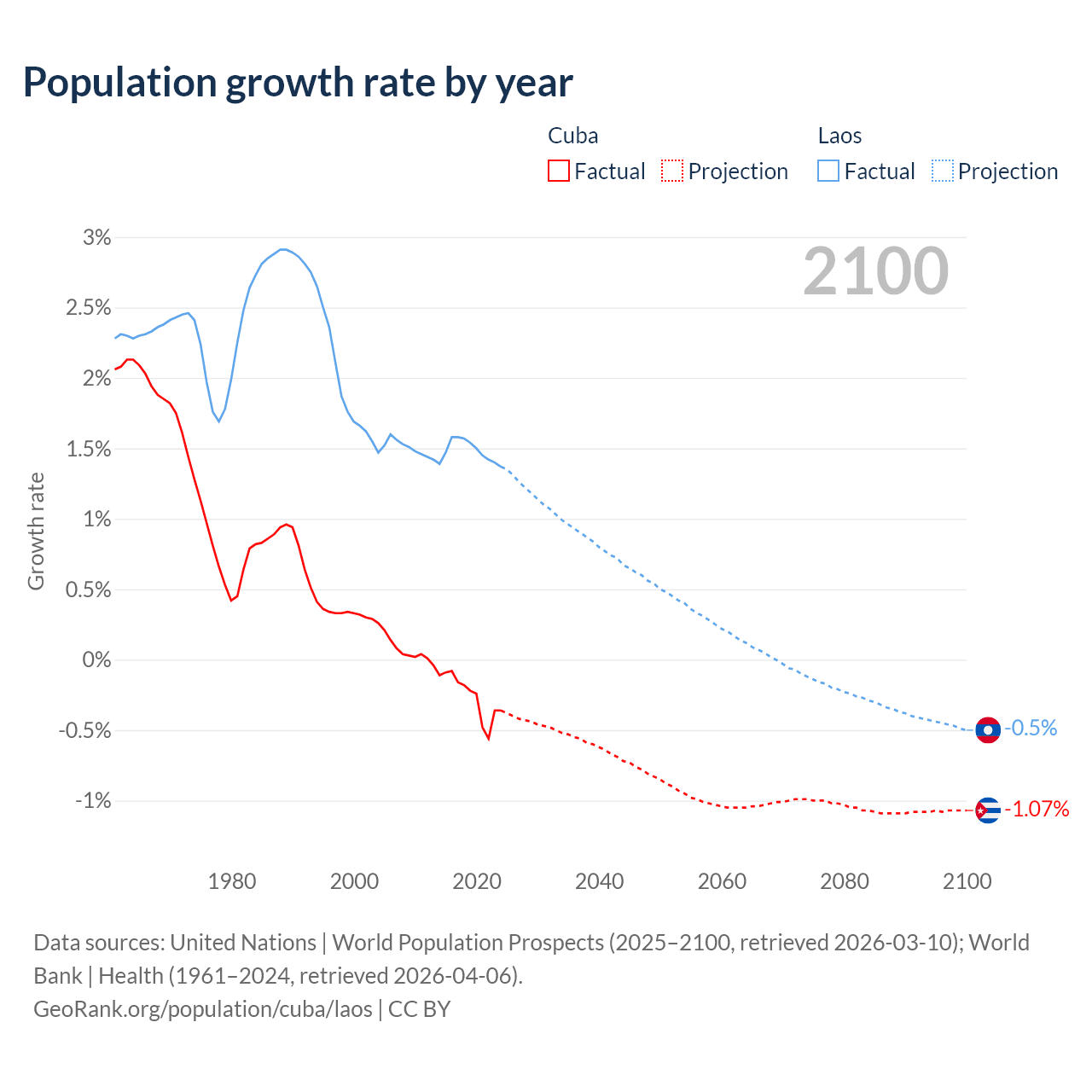 - For the last 10 years, Cuba has had an average growth rate of -0.26% per year vs +1.48% in Laos.