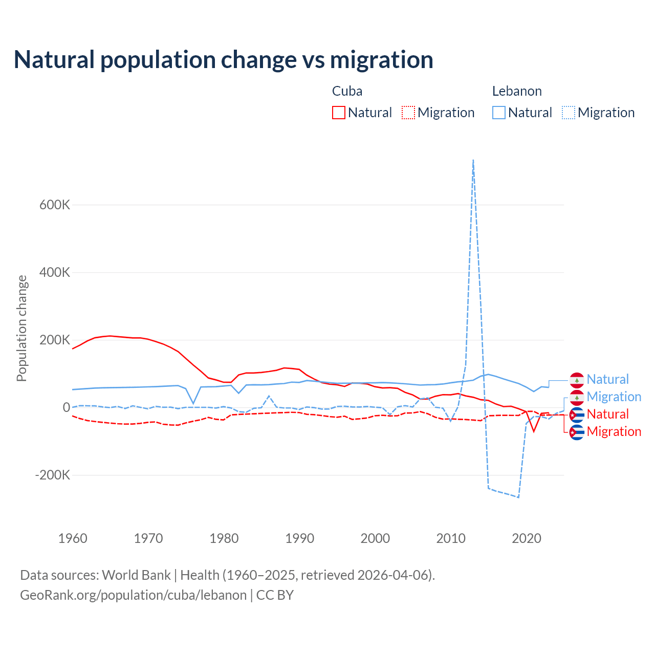 Over the last 10 years, 21.9% of the population change in Cuba is from natural causes (a loss of 64,179 people) and 78.1% is from migration (a loss of 229,508 people). In Lebanon 40.1% is from natural causes (a gain of 739,256 people) and 59.9% is from migration (a loss of 1,103,772 people).