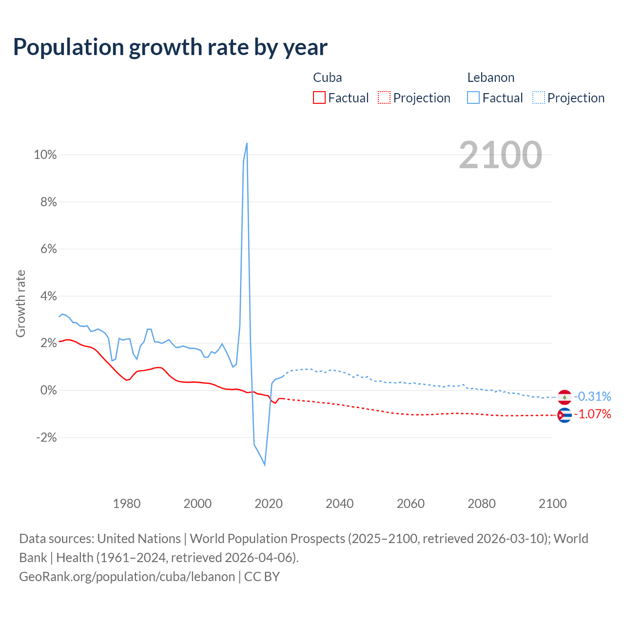 - For the last 10 years, Cuba has had an average growth rate of -0.26% per year vs +0.16% in Lebanon.