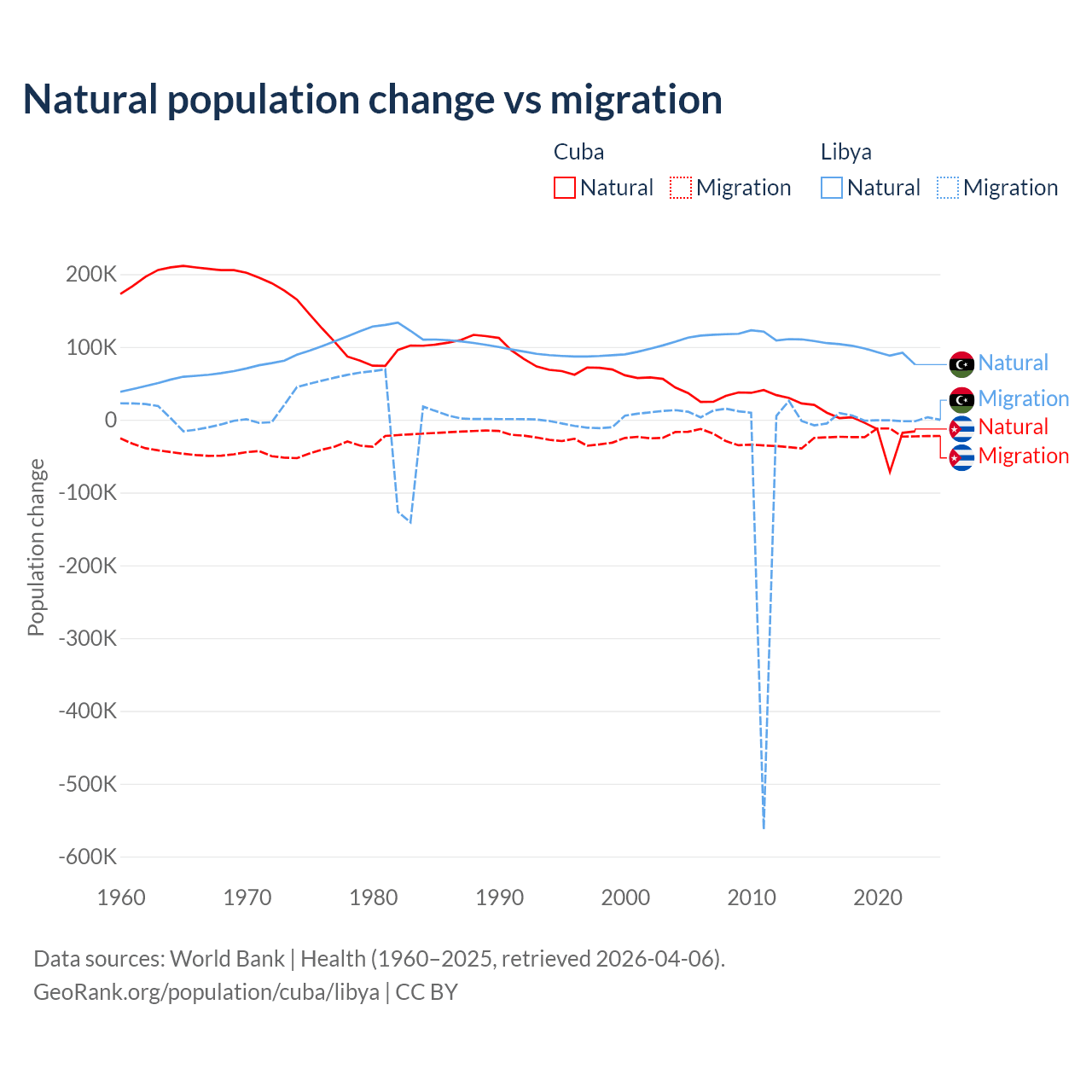 Over the last 10 years, 21.9% of the population change in Cuba is from natural causes (a loss of 64,179 people) and 78.1% is from migration (a loss of 229,508 people). In Libya 99.4% is from natural causes (a gain of 975,799 people) and 0.63% is from migration (a loss of 6,150 people).