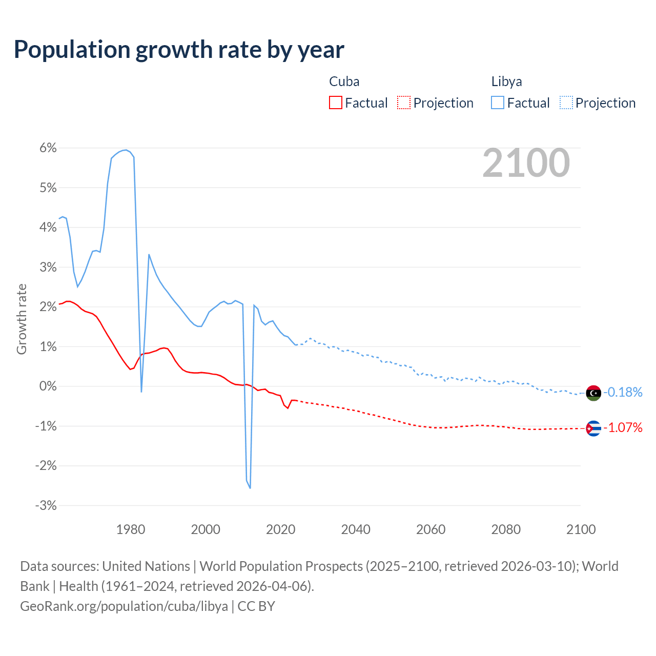 - For the last 10 years, Cuba has had an average growth rate of -0.26% per year vs +1.44% in Libya.