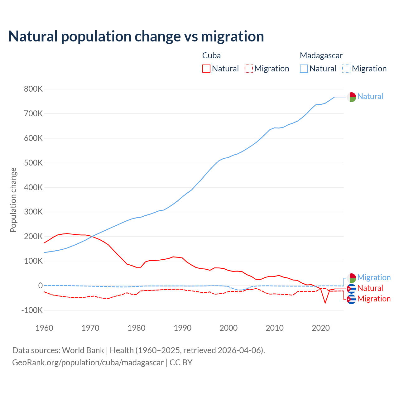 Over the last 10 years, 21.9% of the population change in Cuba is from natural causes (a loss of 64,179 people) and 78.1% is from migration (a loss of 229,508 people). In Madagascar 99.7% is from natural causes (a gain of 7,165,578 people) and 0.31% is from migration (a loss of 22,384 people).