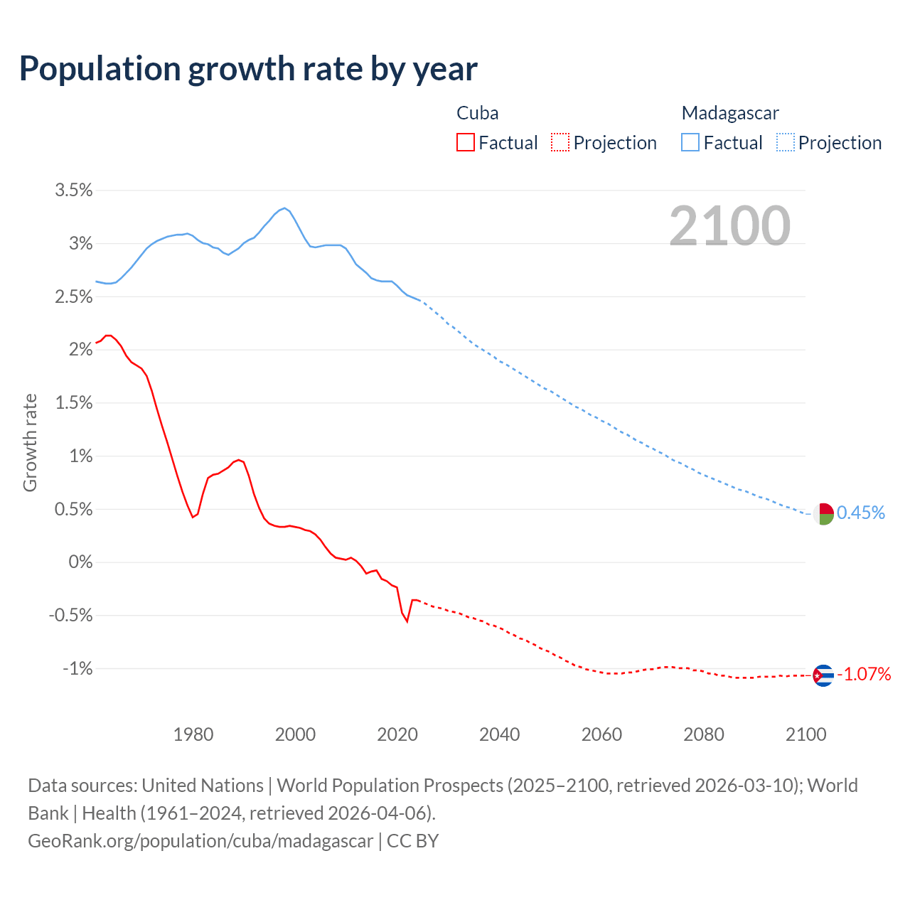 - For the last 10 years, Cuba has had an average growth rate of -0.26% per year vs +2.6% in Madagascar.