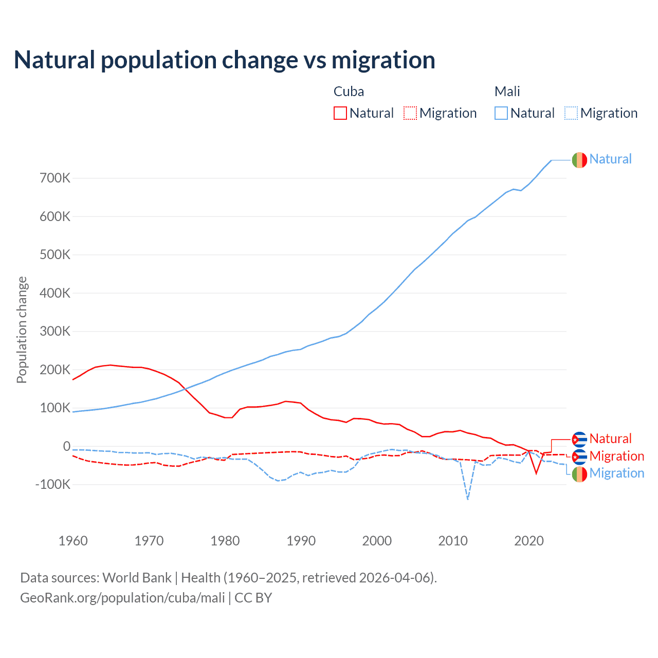 Over the last 10 years, 21.9% of the population change in Cuba is from natural causes (a loss of 64,179 people) and 78.1% is from migration (a loss of 229,508 people). In Mali 94.9% is from natural causes (a gain of 6,749,473 people) and 5.13% is from migration (a loss of 365,292 people).