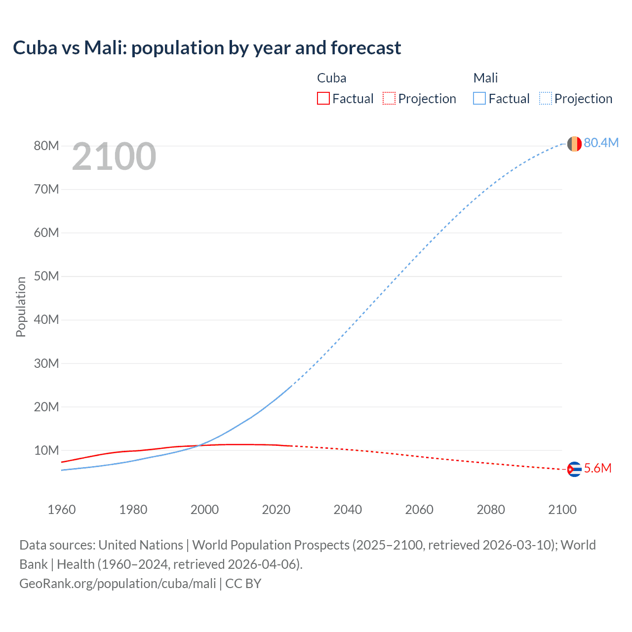 - Since 2006, the population of Cuba has decreased from 11.3M people to 10.9M (3.4% decline), while Mali has grown from 14M to 26.1M (86.9% growth).