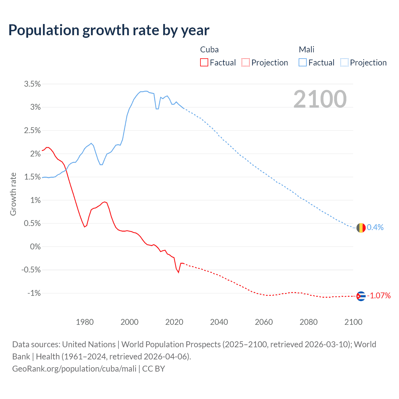 - For the last 10 years, Cuba has had an average growth rate of -0.26% per year vs +3.12% in Mali.
